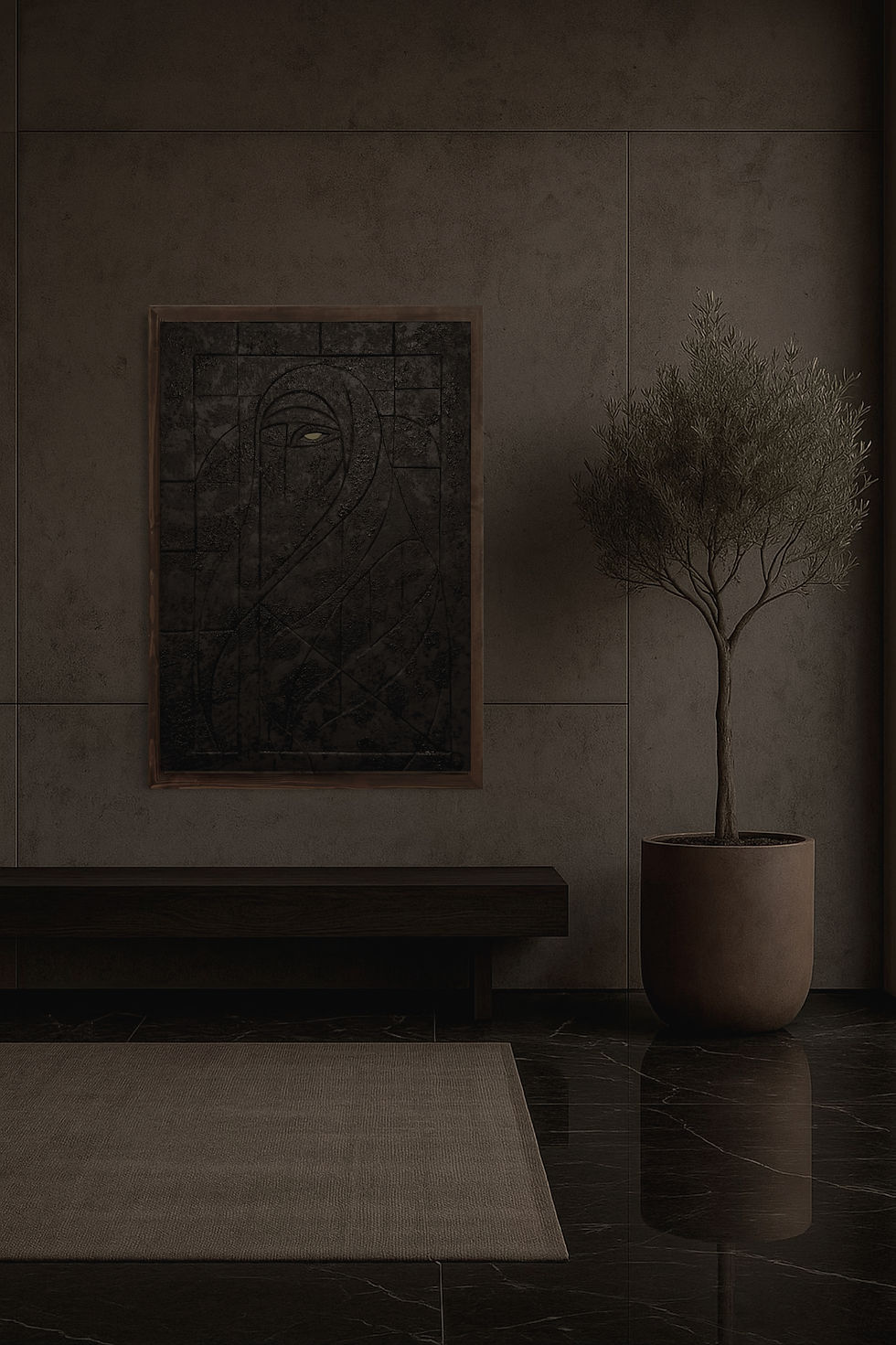 Her form trembles, yet her spirit does not yield. Through the veil, a golden gaze emerges —